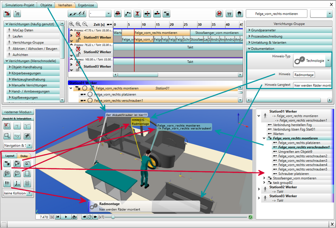 In der 3D-Ansicht können Hinweise und Kommentare über Objekte und Verrichtungen dargestellt werden. Diese Informationen müssen an verschiedenen Stellen definiert werden und können dann in der Rubrik Dokumentation durch Klick auf die abgebildeten Schaltflächen ein- oder ausgeblendet werden (siehe Abbildung Dokumentationsschaltflächen an).