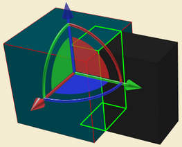 Im Eltern-KOS entspricht die Ausrichtung der Achsen des Manipulator-Hilfsobjekts der Ausrichtung des Koordinatensystems des direkten Elternobjekts des ausgewählten Objekts (in der Abbildung Eltern-KOS ist der gelbe Quader das Elternobjekt der lila Kugel. Der Manipulator übernimmt die Ausrichtung des Eltern-KOS. Damit ist eine Verschiebung der Kugel entlang der schiefen Ebene möglich).