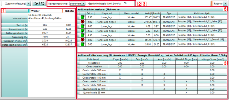 In der Unterregisterkarte MRK Bericht werden Informationen zu Ergebnissen von Mensch-Roboter-Kollaborationen ausgegeben (siehe Abbildung Auswertung MRK Bericht).