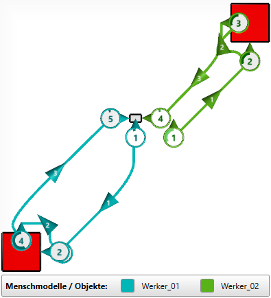 Die erzeugte Grafik zeigt das aktuelle Szenario (3D-Layout) in der Draufsicht an. Dabei werden zum einen alle im 3D-Layout sichtbaren Objekte vereinfacht mit ihren Hüllquadern dargestellt. Zum anderen werden alle während der Simulation eingenommenen Arbeitspositionen und die erzeugten Pfade eingezeichnet.