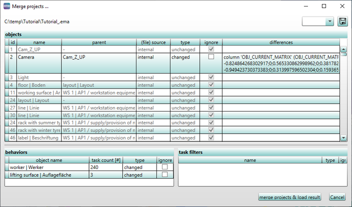 On the other hand it contains Merge projects.... This function allows elements of two projects to be combined. In the example below, contents of a project can be loaded into the first, already open project (see figure Merge projects). The dialog window shows an overview of the objects within the second project. Each object can be included or excluded from the merge, as well as options for each object selected.