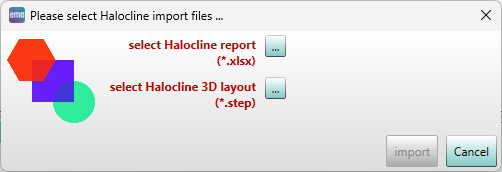 ema Work Designer offers functionalities for importing process and layout information from the Halocline software. By selecting the Import from Halocline ... menu item, an import dialog opens in which Halocline reports and the associated layout can be selected and imported in the appropriate formats (see figure Import options).