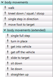 The tasks are based on an internal “Task hierarchy”. All tasks are coarsely divided into two groups – elementary tasks and complex tasks. Elementary tasks are basic modules which are reused within superordinate complex tasks. For example, the task Walk internally uses the task Move foot to target. The main objective of the task structuring is to have a combinability amongst the tasks which is as intuitive and as universal as possible. Each of the following explanations of the individual tasks includes a section “Subordinate task”. The elementary tasks constituting the superordinate tasks can be found here.
